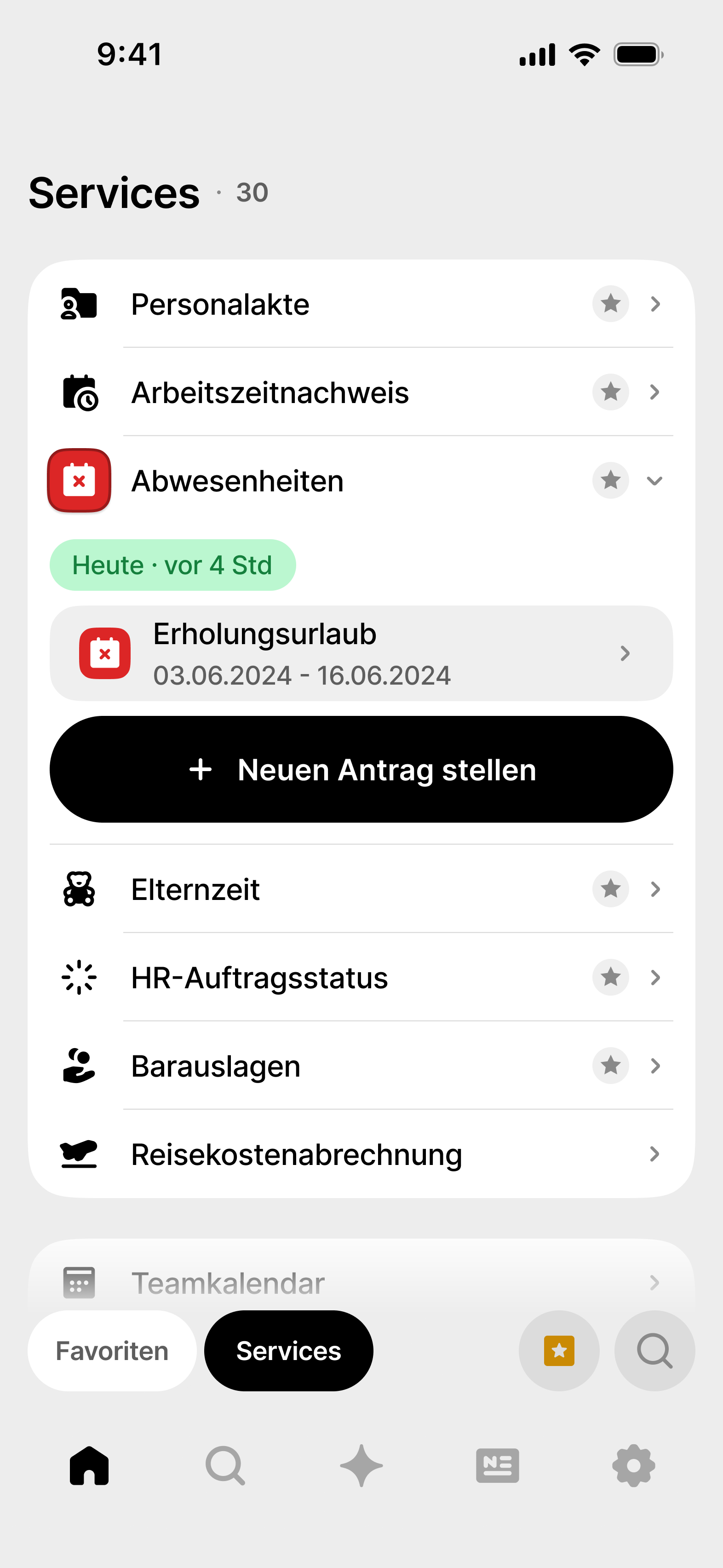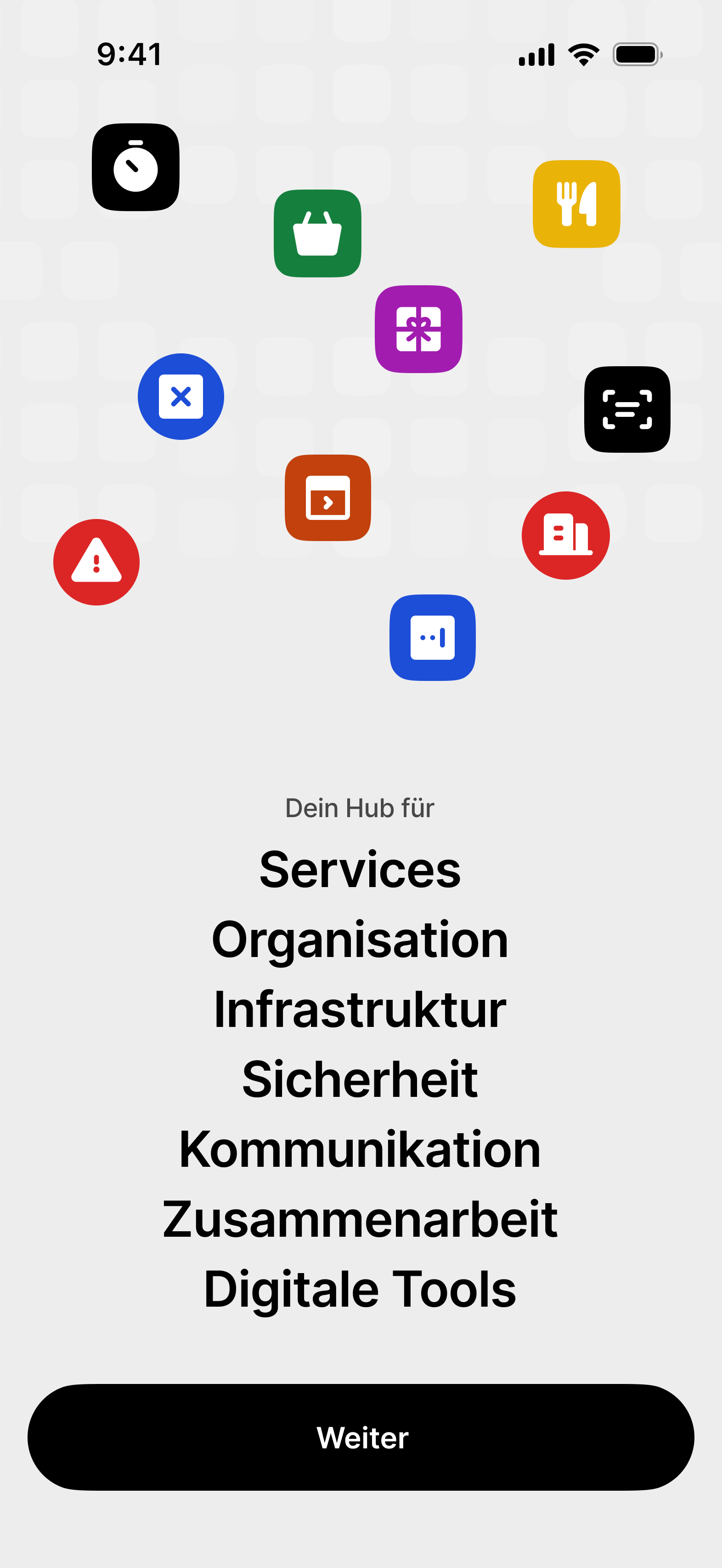 Enterprise employee app targeting time tracking, room booking, HR processes, and facility management for large corporations requiring streamlined, distraction-free workflow efficiency.
